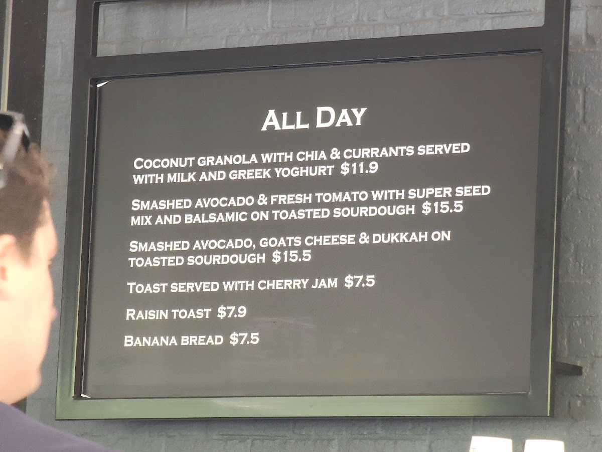 - All Day Choices: Smashed Avo at A$14.90, Granola at A$11.90